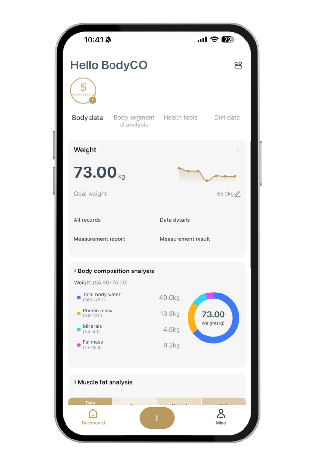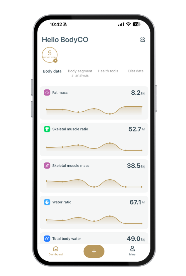 يُجمّع BodyCO مقاييس الجسم الرئيسية في تقييم صحي واضح، بما في ذلك عمر جسمك. تساعدك هذه النتيجة سهلة القراءة على تتبّع التقدم العام بنظرة واحدة، مما يحفزك على الثبات واتخاذ قرارات أفضل بشأن نمط حياتك.