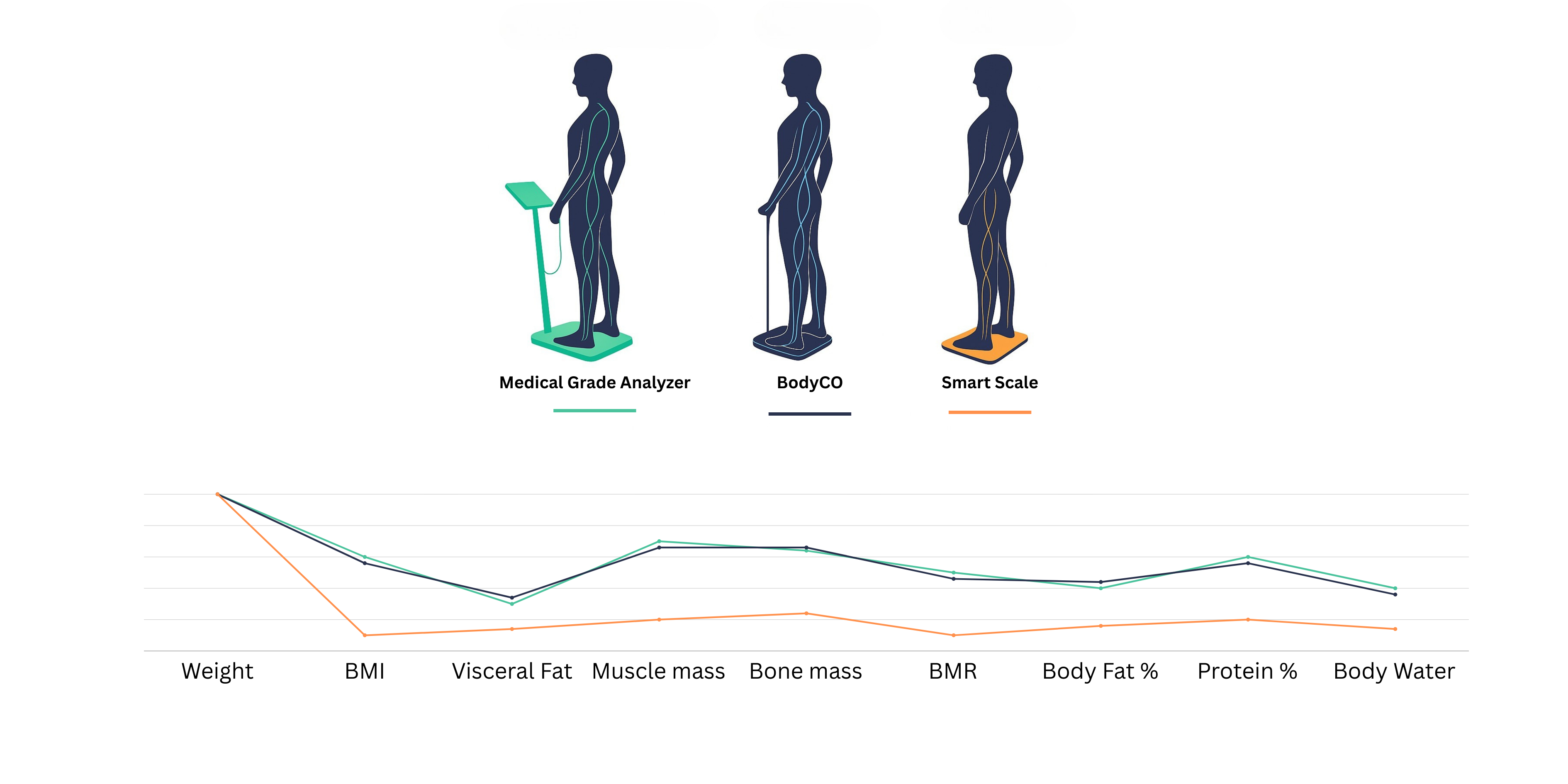يحقق BodyCO ارتباطًا بنسبة تزيد عن 97% مع أجهزة التحليل الاحترافية مثل InBody 270، مما يوفر دقة شبه سريرية من راحة المنزل