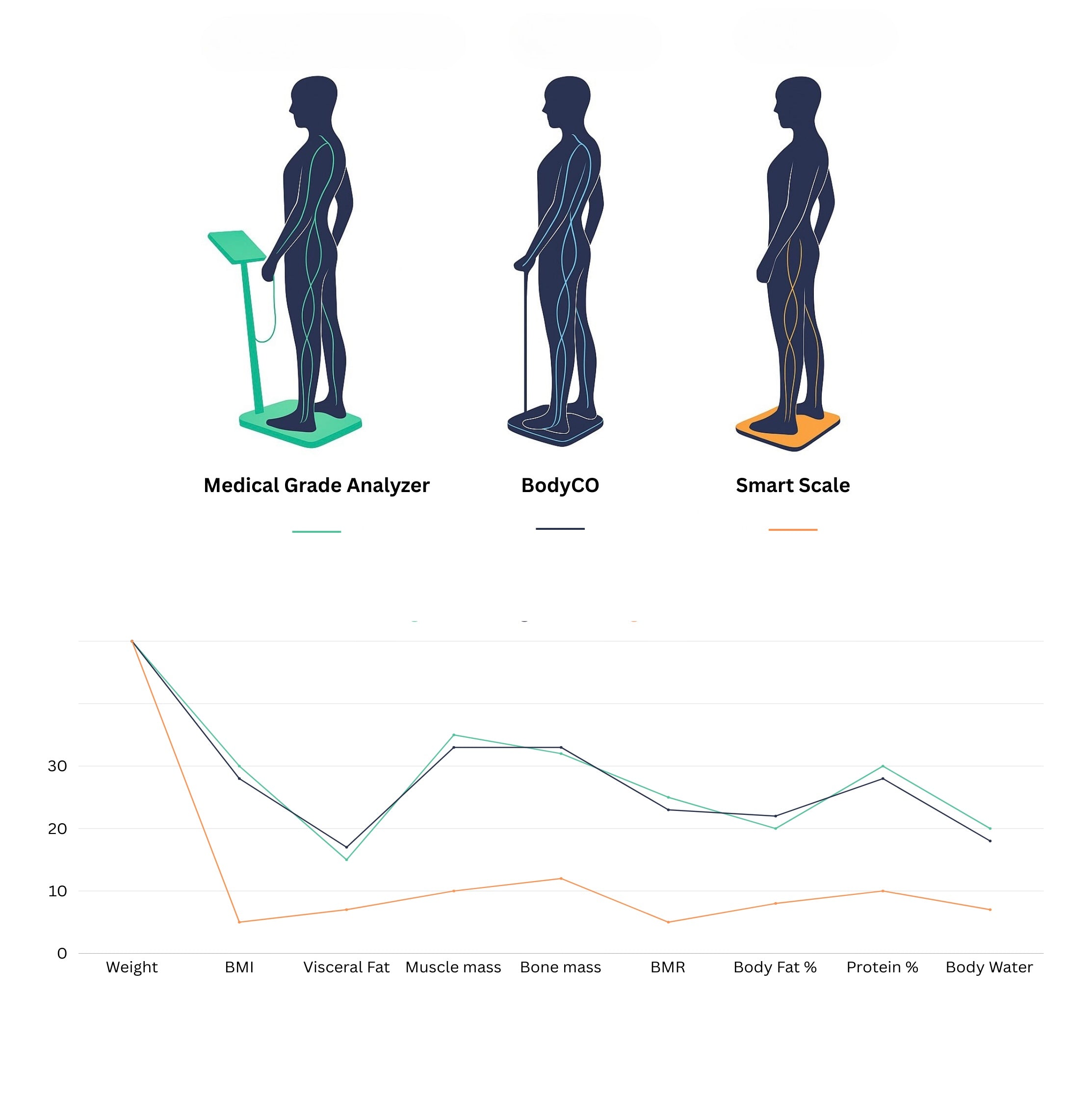 معظم المقاييس الذكية تُقدّر فقط، وتقيس جزءًا من الجسم وتترك لك مجالًا للتخمين. أما BodyCO، فهو يتخطى ذلك، إذ يُقدّم تحليلًا شاملًا للجسم بدقة طبية عالية. من كتلة العضلات إلى نسبة الدهون والماء في الجسم، يتم قياس كل مقياس بدقة، مما يمنحك بيانات موثوقة لمتابعة تقدمك وتحقيق أهدافك الصحية بثقة.