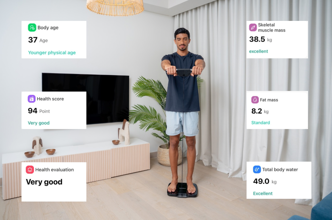 تحكم بصحتك مع ميزان BodyCO الذكي ، جهاز مراقبة حيوي متطور مزود بـ 8 أقطاب كهربائية متطورة و 56 مقياسًا دقيقًا للجسم . صُمم هذا الميزان المتطور لتكوين الجسم خصيصًا للأفراد المهتمين بصحتهم في دول مجلس التعاون الخليجي، ويوفر رؤية شاملة بزاوية 360 درجة لصحة جسمك، مما يساعدك على تتبع تقدمك بدقة لا مثيل لها. متوفر حاليًا في الإمارات العربية المتحدة فقط، وهو رفيقك الأمثل لتحقيق أهدافك في اللياقة البدنية.